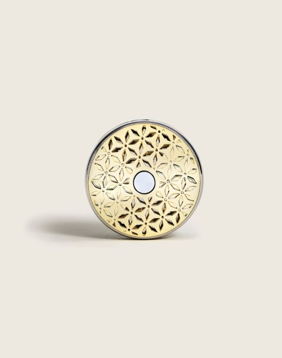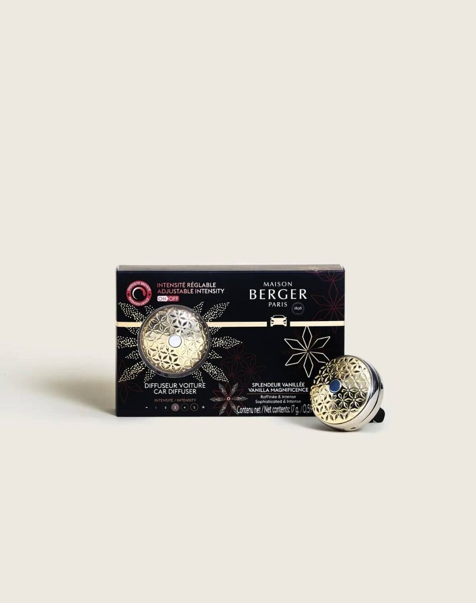 Gold and silver adjustable car diffuser with Vanilla Magnificence fragrance for a festive, warm and customisable scent experience.