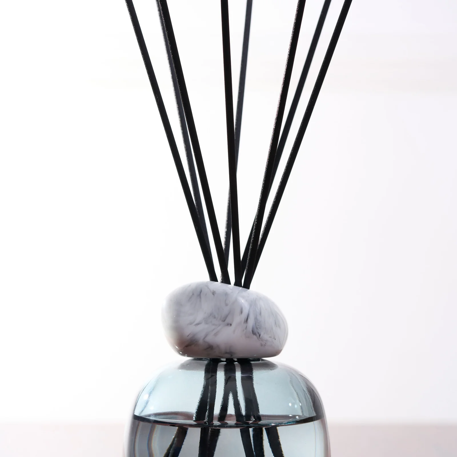 The Blue Mineral Scented Bouquet pairs a smoky blue lacquered glass body with a white marbled ring, giving this scented bouquet a serene and sophisticated look that complements modern interiors.