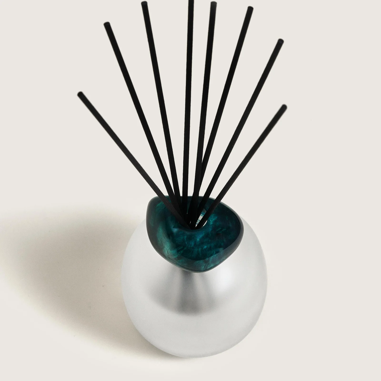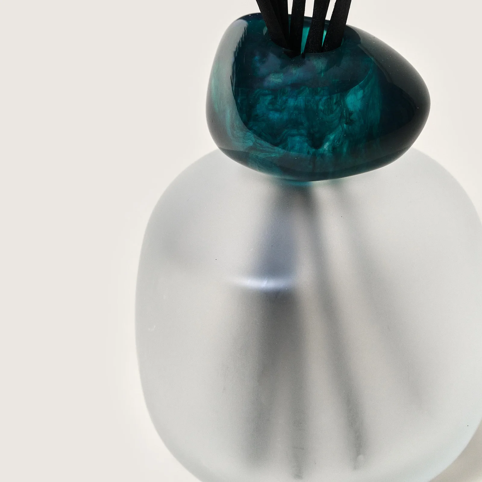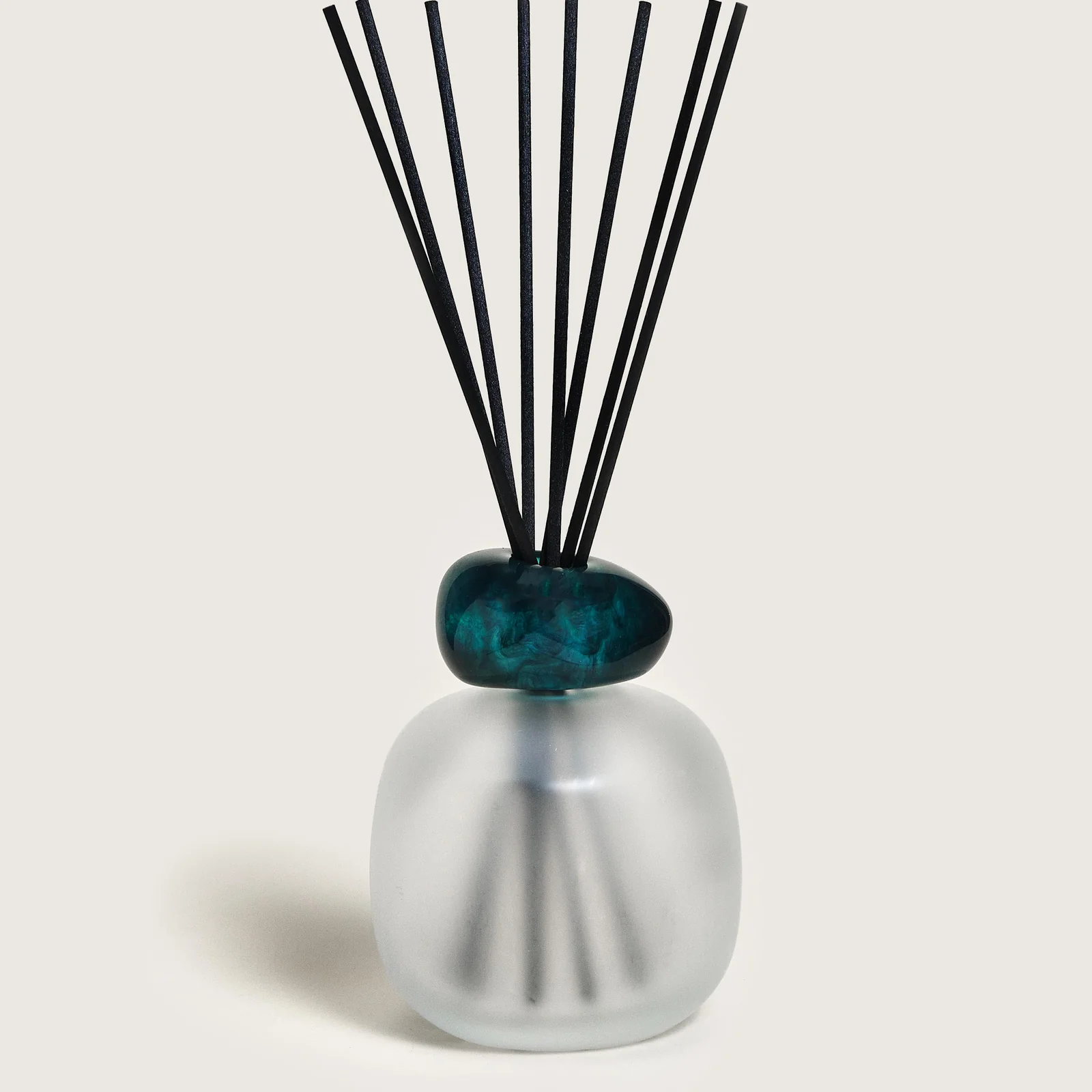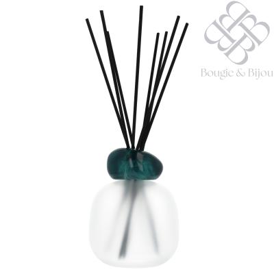 The Blue Seduction Mineral Scented Bouquet blends a frosted lacquered glass body with a translucent emerald ring, creating a sophisticated decorative piece that adds a cool, contemporary touch to your interior.